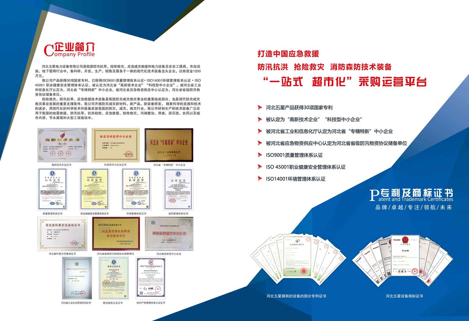 河北五星電力設(shè)備有限公司是我國(guó)防汛抗旱、搶險(xiǎn)救災(zāi)、應(yīng)急減災(zāi)救援和電力設(shè)備及安全工器具、市政設(shè)施、地下管網(wǎng)行業(yè)中,集科研、開發(fā)、生產(chǎn)、銷售及服務(wù)于一體的現(xiàn)代化技術(shù)裝備高新技術(shù)企業(yè),注冊(cè)資金1200萬元。  我公司產(chǎn)品已獲得ISO9001質(zhì)量管理體系...